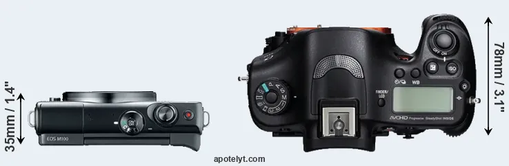 The side-by-side display below illustrates the physical size and weight of the Canon M100 and the Sony A99. The two cameras are presented according to their relative size. Three consecutive views from the front, the top, and the rear side are shown. All width, height and depth dimensions are rounded to the nearest millimeter.