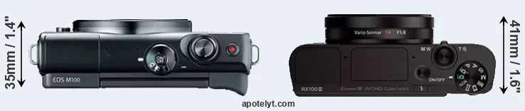 The side-by-side display below illustrates the physical size and weight of the Canon M100 and the Sony RX100 III. The two cameras are presented according to their relative size. Three consecutive views from the front, the top, and the rear side are shown. All width, height and depth dimensions are rounded to the nearest millimeter.
