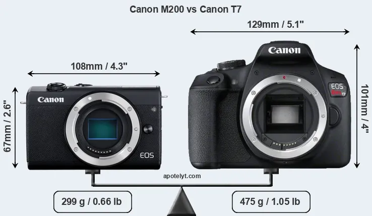 An illustration of the physical size and weight of the Canon M200 and the Canon T7 is provided in the side-by-side display below. The two cameras are presented according to their relative size. Three successive views from the front, the top, and the rear are shown. All width, height and depth measures are rounded to the nearest millimeter.
