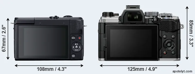 The physical size and weight of the Canon M200 and the OM System OM-5 are illustrated in the side-by-side display below. The two cameras are presented according to their relative size. Three consecutive perspectives from the front, the top, and the back are available. All width, height and depth dimensions are rounded to the nearest millimeter.
