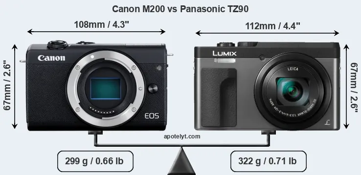 An illustration of the physical size and weight of the Canon M200 and the Panasonic TZ90 is provided in the side-by-side display below. The two cameras are presented according to their relative size. Three consecutive views from the front, the top, and the rear side are shown. All width, height and depth dimensions are rounded to the nearest millimeter.