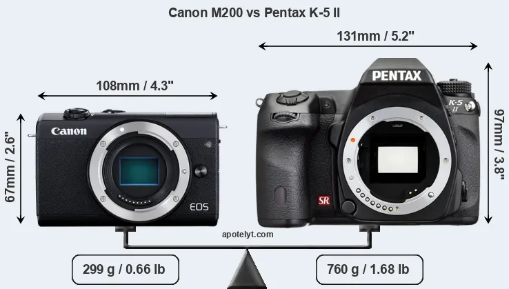 The physical size and weight of the Canon M200 and the Pentax K-5 II are illustrated in the side-by-side display below. The two cameras are presented according to their relative size. Three consecutive perspectives from the front, the top, and the back are available. All width, height and depth dimensions are rounded to the nearest millimeter.