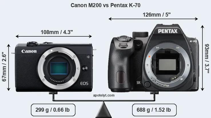 If the front view area (width x height) of the cameras is taken as an aggregate measure of their size, the Pentax K-70 is considerably larger (62 percent) than the Canon M200. Moreover, the K-70 is substantially heavier (130 percent) than the M200. It is noteworthy in this context that the K-70 is splash and dust-proof, while the M200 does not feature any corresponding weather-sealing.