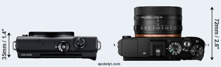 If the front view area (width x height) of the cameras is taken as an aggregate measure of their size, the Sony RX1R II is somewhat larger (2 percent) than the Canon M200. In this context, it is worth noting that neither the M200 nor the RX1R II are weather-sealed.