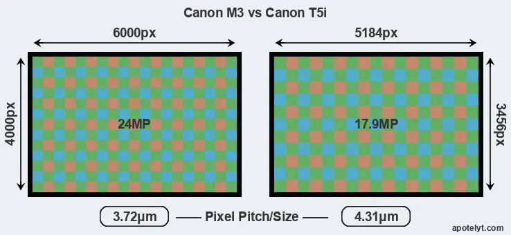 While the two cameras under review share the same sensor size, the M3 offers a higher resolution of 24 megapixels, compared with 17.9 MP of the T5i. This megapixels advantage translates into a 16 percent gain in linear resolution. On the other hand, these sensor specs imply that the M3 has a higher pixel density and a smaller size of the individual pixel (with a pixel pitch of 3.72μm versus 4.31μm for the T5i). In this context, it should be noted, however, that the M3 is a somewhat more recent model (by 1 year and 10 months) than the T5i, and its sensor might have benefitted from technological advances during this time that at least partly compensate for the smaller pixel size.