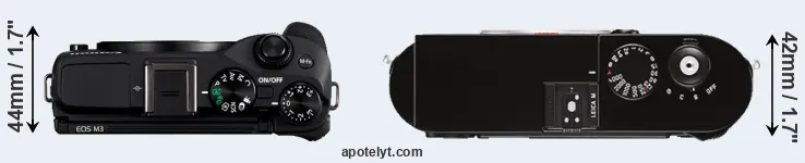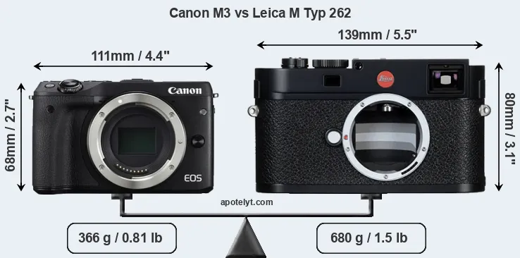 The Canon EOS M3 and the Leica M (Typ 262) are two digital cameras that were announced, respectively, in February 2015 and November 2015. The M3 is a mirrorless interchangeable lens camera, while the M Typ 262 is a rangefinder-focusing mirrorless. The cameras are based on an APS-C (M3) and a full frame (M Typ 262) sensor. The Canon has a resolution of 24 megapixels, whereas the Leica provides 23.7 MP.