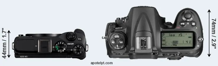 The side-by-side display below illustrates the physical size and weight of the Canon M3 and the Nikon D300. The two cameras are presented according to their relative size. Three consecutive views from the front, the top, and the rear side are shown. All width, height and depth dimensions are rounded to the nearest millimeter.