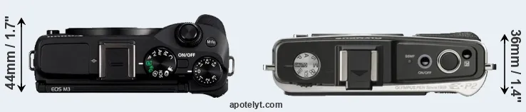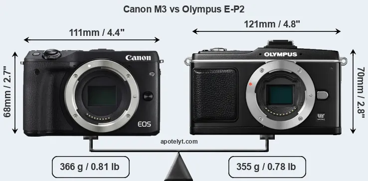 An illustration of the physical size and weight of the Canon M3 and the Olympus E-P2 is provided in the side-by-side display below. The two cameras are presented according to their relative size. Three consecutive perspectives from the front, the top, and the back are available. All width, height and depth dimensions are rounded to the nearest millimeter.