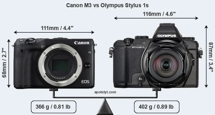 An illustration of the physical size and weight of the Canon M3 and the Olympus Stylus 1s is provided in the side-by-side display below. The two cameras are presented according to their relative size. Three consecutive perspectives from the front, the top, and the back are available. All size dimensions are rounded to the nearest millimeter.