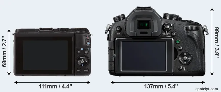 The side-by-side display below illustrates the physical size and weight of the Canon M3 and the Panasonic FZ1000. The two cameras are presented according to their relative size. Three consecutive views from the front, the top, and the rear side are shown. All width, height and depth dimensions are rounded to the nearest millimeter.