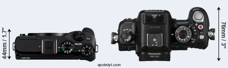 The physical size and weight of the Canon M3 and the Panasonic GH2 are illustrated in the side-by-side display below. The two cameras are presented according to their relative size. Three successive views from the front, the top, and the rear are shown. All width, height and depth measures are rounded to the nearest millimeter.