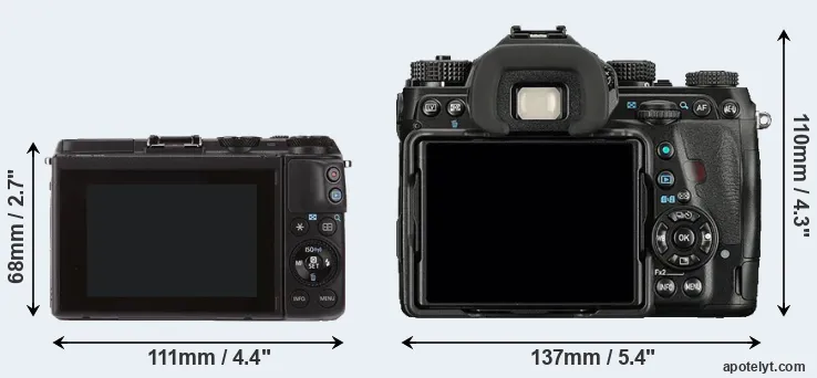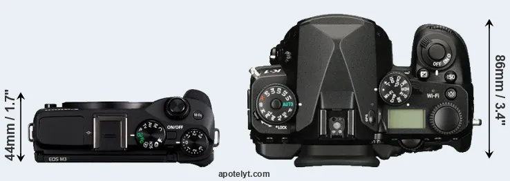 The physical size and weight of the Canon M3 and the Pentax K-1 are illustrated in the side-by-side display below. The two cameras are presented according to their relative size. Three consecutive perspectives from the front, the top, and the back are available. All width, height and depth dimensions are rounded to the nearest millimeter.