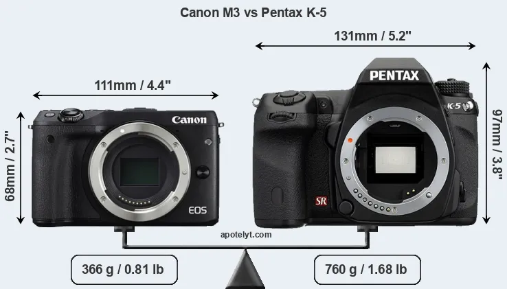 If the front view area (width x height) of the cameras is taken as an aggregate measure of their size, the Pentax K-5 is considerably larger (68 percent) than the Canon M3. Moreover, the K-5 is substantially heavier (108 percent) than the M3. It is noteworthy in this context that the K-5 is splash and dust-proof, while the M3 does not feature any corresponding weather-sealing.