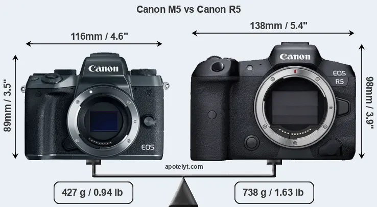 If the front view area (width x height) of the cameras is taken as an aggregate measure of their size, the Canon R5 is notably larger (31 percent) than the Canon M5. Moreover, the R5 is substantially heavier (73 percent) than the M5. It is noteworthy in this context that the R5 is splash and dust-proof, while the M5 does not feature any corresponding weather-sealing.