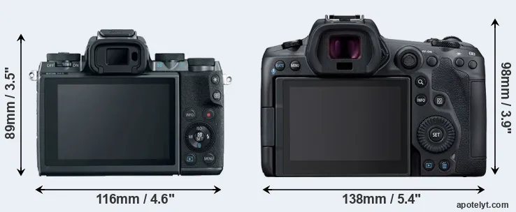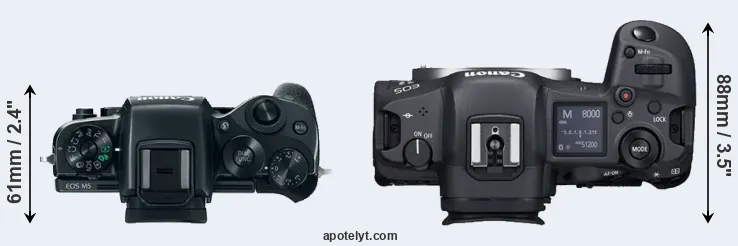 The side-by-side display below illustrates the physical size and weight of the Canon M5 and the Canon R5. The two cameras are presented according to their relative size. Three consecutive views from the front, the top, and the rear side are shown. All width, height and depth dimensions are rounded to the nearest millimeter.