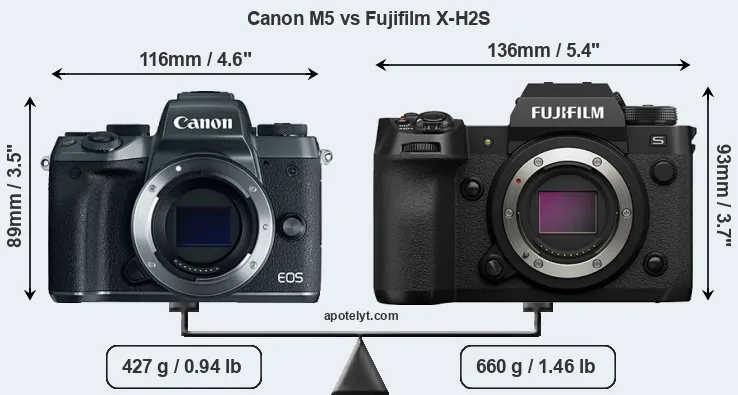 If the front view area (width x height) of the cameras is taken as an aggregate measure of their size, the Fujifilm X-H2S is notably larger (23 percent) than the Canon M5. Moreover, the X-H2S is substantially heavier (55 percent) than the M5. It is noteworthy in this context that the X-H2S is splash and dust-proof, while the M5 does not feature any corresponding weather-sealing.
