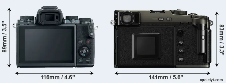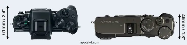 The physical size and weight of the Canon M5 and the Fujifilm X-Pro3 are illustrated in the side-by-side display below. The two cameras are presented according to their relative size. Three consecutive views from the front, the top, and the rear side are shown. All width, height and depth measures are rounded to the nearest millimeter.
