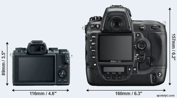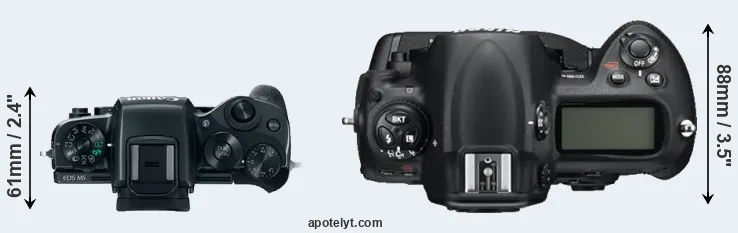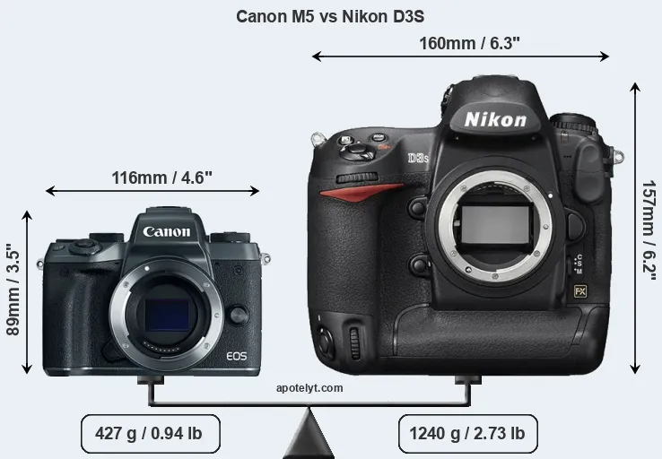 If the front view area (width x height) of the cameras is taken as an aggregate measure of their size, the Nikon D3S is considerably larger (143 percent) than the Canon M5. Moreover, the D3S is substantially heavier (190 percent) than the M5. It is noteworthy in this context that the D3S is splash and dust-proof, while the M5 does not feature any corresponding weather-sealing.