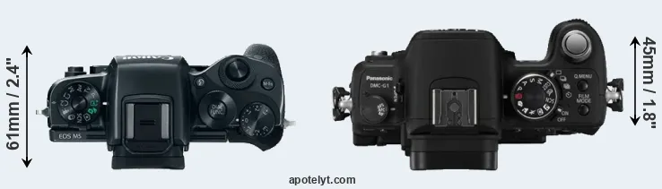 If the front view area (width x height) of the cameras is taken as an aggregate measure of their size, the Canon M5 and the Panasonic G1 are of equal size. However, the G1 is markedly lighter (16 percent) than the M5. In this context, it is worth noting that neither the M5 nor the G1 are weather-sealed.