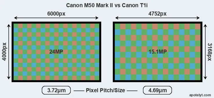 While the two cameras under review share the same sensor size, the M50 Mark II offers a higher resolution of 24 megapixels, compared with 15.1 MP of the T1i. This megapixels advantage translates into a 26 percent gain in linear resolution. On the other hand, these sensor specs imply that the M50 Mark II has a higher pixel density and a smaller size of the individual pixel (with a pixel pitch of 3.72μm versus 4.69μm for the T1i). In this context, it should be noted, however, that the M50 Mark II is much more recent (by 11 years and 6 months) than the T1i, and its sensor will have benefitted from technological advances during this time that compensate for the smaller pixel size.