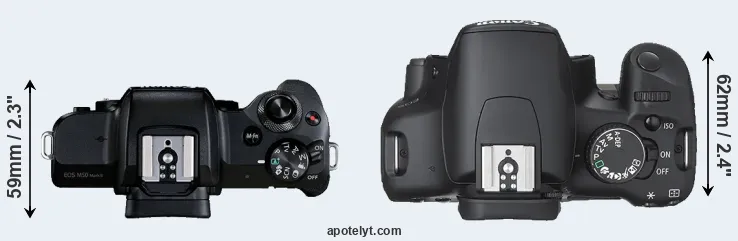 The side-by-side display below illustrates the physical size and weight of the Canon M50 Mark II and the Canon XSi. The two cameras are presented according to their relative size. Three successive views from the front, the top, and the rear are shown. All width, height and depth measures are rounded to the nearest millimeter.