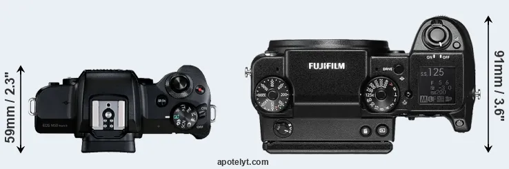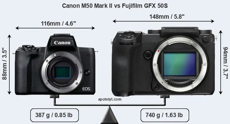 An illustration of the physical size and weight of the Canon M50 Mark II and the Fujifilm GFX 50S is provided in the side-by-side display below. The two cameras are presented according to their relative size. Three consecutive views from the front, the top, and the rear side are shown. All width, height and depth dimensions are rounded to the nearest millimeter.