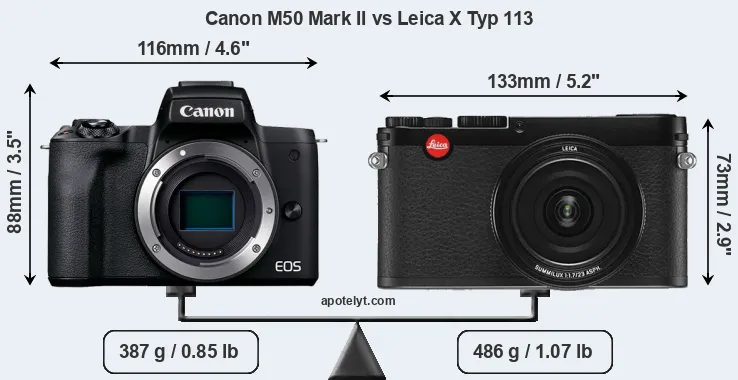 An illustration of the physical size and weight of the Canon M50 Mark II and the Leica X Typ 113 is provided in the side-by-side display below. The two cameras are presented according to their relative size. Three successive views from the front, the top, and the rear are shown. All size dimensions are rounded to the nearest millimeter.