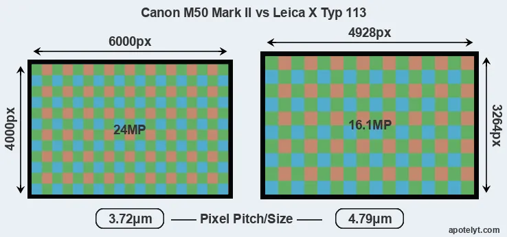 Despite having a smaller sensor, the Canon M50 Mark II offers a higher resolution of 24 megapixels, compared with 16.1 MP of the Leica X Typ 113. This megapixels advantage comes at the cost of a higher pixel density and a smaller size of the individual pixel (with a pixel pitch of 3.72μm versus 4.79μm for the X Typ 113). However, it should be noted that the M50 Mark II is much more recent (by 6 years) than the X Typ 113, and its sensor will have benefitted from technological advances during this time that make it possible to gather light more efficiently.