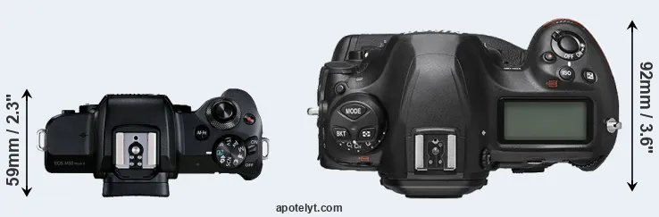 An illustration of the physical size and weight of the Canon M50 Mark II and the Nikon D6 is provided in the side-by-side display below. The two cameras are presented according to their relative size. Three consecutive perspectives from the front, the top, and the back are available. All size dimensions are rounded to the nearest millimeter.
