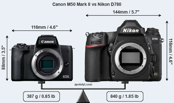 The physical size and weight of the Canon M50 Mark II and the Nikon D780 are illustrated in the side-by-side display below. The two cameras are presented according to their relative size. Three consecutive perspectives from the front, the top, and the back are available. All width, height and depth dimensions are rounded to the nearest millimeter.