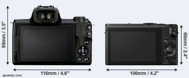 The side-by-side display below illustrates the physical size and weight of the Canon M50 Mark II and the Panasonic LX15. The two cameras are presented according to their relative size. Three consecutive perspectives from the front, the top, and the back are available. All width, height and depth measures are rounded to the nearest millimeter.