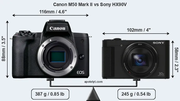 An illustration of the physical size and weight of the Canon M50 Mark II and the Sony HX90V is provided in the side-by-side display below. The two cameras are presented according to their relative size. Three successive views from the front, the top, and the rear are shown. All width, height and depth dimensions are rounded to the nearest millimeter.