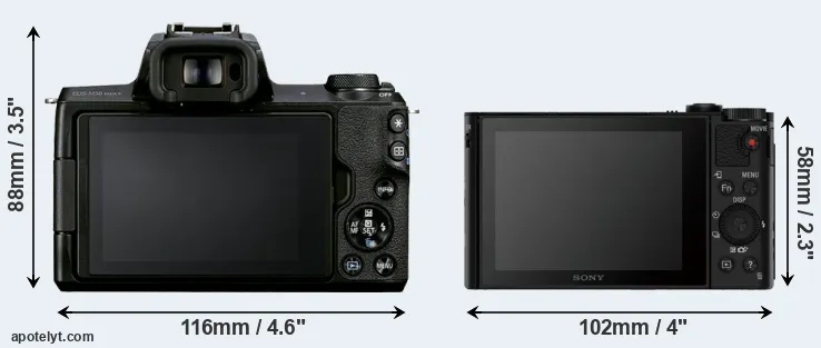 If the front view area (width x height) of the cameras is taken as an aggregate measure of their size, the Sony HX90V is considerably smaller (42 percent) than the Canon M50 Mark II. In this context, it is worth noting that neither the M50 Mark II nor the HX90V are weather-sealed.