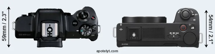 An illustration of the physical size and weight of the Canon M50 Mark II and the Sony ZV-E10 II is provided in the side-by-side display below. The two cameras are presented according to their relative size. Three consecutive views from the front, the top, and the rear side are shown. All width, height and depth measures are rounded to the nearest millimeter.