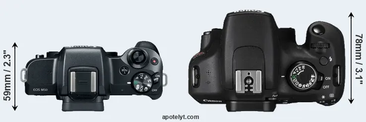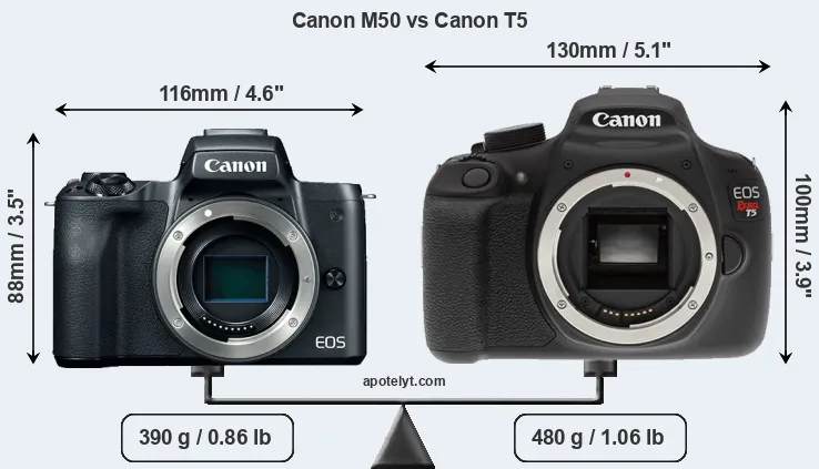 The side-by-side display below illustrates the physical size and weight of the Canon M50 and the Canon T5. The two cameras are presented according to their relative size. Three consecutive perspectives from the front, the top, and the back are available. All size dimensions are rounded to the nearest millimeter.