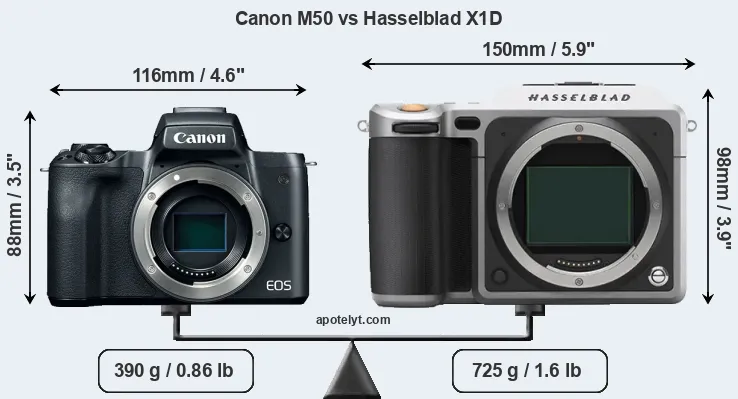 If the front view area (width x height) of the cameras is taken as an aggregate measure of their size, the Hasselblad X1D is considerably larger (44 percent) than the Canon M50. Moreover, the X1D is substantially heavier (86 percent) than the M50. It is noteworthy in this context that the X1D is splash and dust-proof, while the M50 does not feature any corresponding weather-sealing.