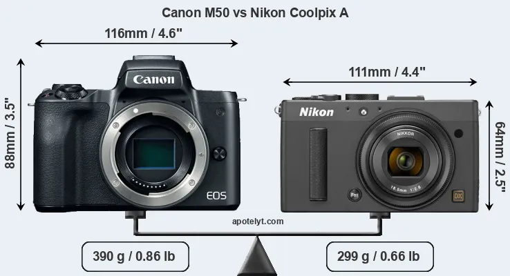 The side-by-side display below illustrates the physical size and weight of the Canon M50 and the Nikon Coolpix A. The two cameras are presented according to their relative size. Three consecutive perspectives from the front, the top, and the back are available. All width, height and depth measures are rounded to the nearest millimeter.