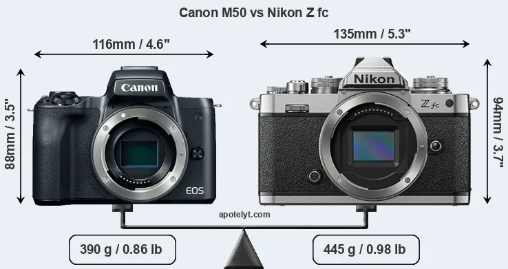 If the front view area (width x height) of the cameras is taken as an aggregate measure of their size, the Nikon Z fc is notably larger (24 percent) than the Canon M50. Moreover, the Z fc is markedly heavier (14 percent) than the M50. In this context, it is worth noting that neither the M50 nor the Z fc are weather-sealed.