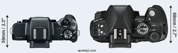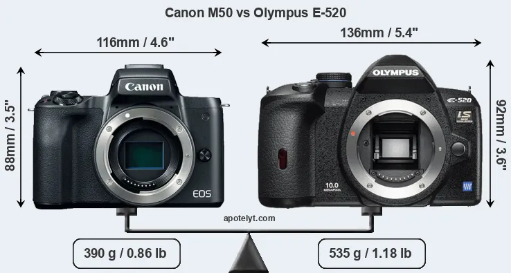 An illustration of the physical size and weight of the Canon M50 and the Olympus E-520 is provided in the side-by-side display below. The two cameras are presented according to their relative size. Three successive views from the front, the top, and the rear are shown. All width, height and depth dimensions are rounded to the nearest millimeter.