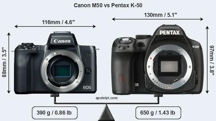 If the front view area (width x height) of the cameras is taken as an aggregate measure of their size, the Pentax K-50 is notably larger (24 percent) than the Canon M50. Moreover, the K-50 is substantially heavier (67 percent) than the M50. It is noteworthy in this context that the K-50 is splash and dust-proof, while the M50 does not feature any corresponding weather-sealing.