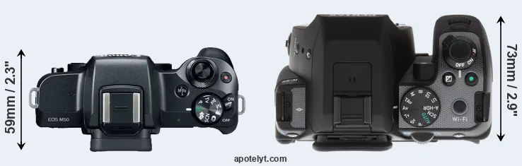 The side-by-side display below illustrates the physical size and weight of the Canon M50 and the Pentax K-S2. The two cameras are presented according to their relative size. Three consecutive perspectives from the front, the top, and the back are available. All size dimensions are rounded to the nearest millimeter.