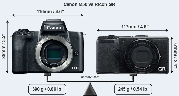 The side-by-side display below illustrates the physical size and weight of the Canon M50 and the Ricoh GR. The two cameras are presented according to their relative size. Three successive views from the front, the top, and the rear are shown. All width, height and depth dimensions are rounded to the nearest millimeter.