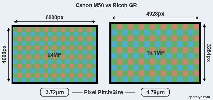 Despite having a smaller sensor, the Canon M50 offers a higher resolution of 24 megapixels, compared with 16.1 MP of the Ricoh GR. This megapixels advantage comes at the cost of a higher pixel density and a smaller size of the individual pixel (with a pixel pitch of 3.72μm versus 4.79μm for the GR). However, it should be noted that the M50 is much more recent (by 4 years and 10 months) than the GR, and its sensor will have benefitted from technological advances during this time that make it possible to gather light more efficiently. Coming back to sensor resolution, it should be mentioned that the GR has no anti-alias filter installed, so that it can capture all the detail its sensor resolves.