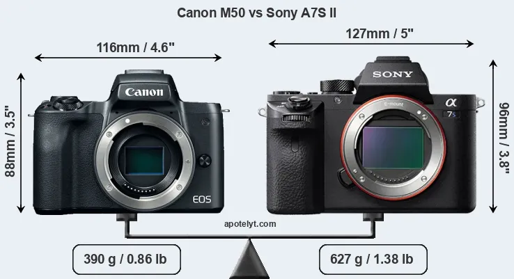 An illustration of the physical size and weight of the Canon M50 and the Sony A7S II is provided in the side-by-side display below. The two cameras are presented according to their relative size. Three consecutive perspectives from the front, the top, and the back are available. All width, height and depth measures are rounded to the nearest millimeter.