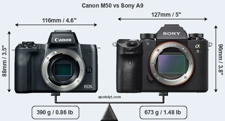 If the front view area (width x height) of the cameras is taken as an aggregate measure of their size, the Sony A9 is notably larger (19 percent) than the Canon M50. Moreover, the A9 is substantially heavier (73 percent) than the M50. It is noteworthy in this context that the A9 is splash and dust-proof, while the M50 does not feature any corresponding weather-sealing.
