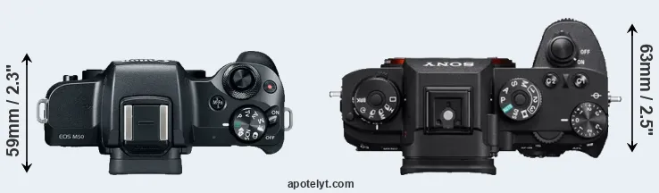 The physical size and weight of the Canon M50 and the Sony A9 are illustrated in the side-by-side display below. The two cameras are presented according to their relative size. Three successive views from the front, the top, and the rear are shown. All width, height and depth measures are rounded to the nearest millimeter.