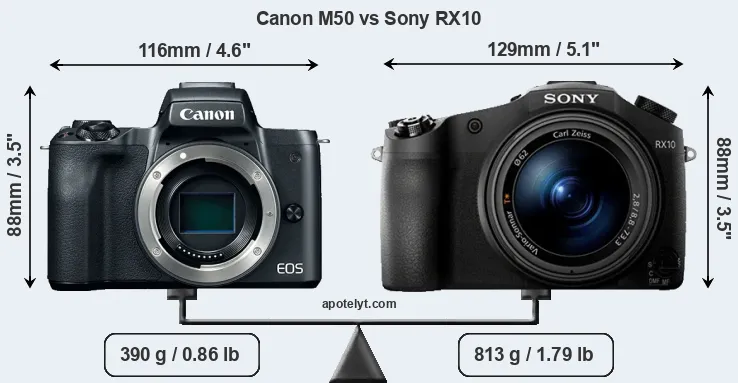 If the front view area (width x height) of the cameras is taken as an aggregate measure of their size, the Sony RX10 is notably larger (11 percent) than the Canon M50. It is noteworthy in this context that the RX10 is splash and dust-proof, while the M50 does not feature any corresponding weather-sealing.