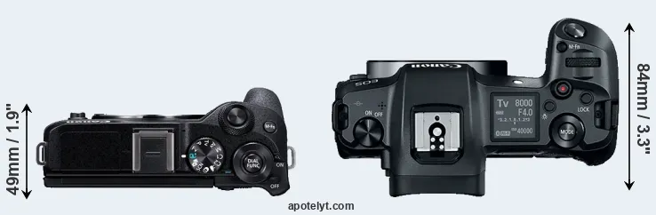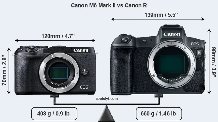 If the front view area (width x height) of the cameras is taken as an aggregate measure of their size, the Canon R is considerably larger (62 percent) than the Canon M6 Mark II. Moreover, the Canon R is substantially heavier (62 percent) than the M6 Mark II. It is noteworthy in this context that the Canon R is splash and dust-proof, while the M6 Mark II does not feature any corresponding weather-sealing.