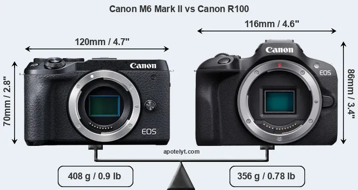 If the front view area (width x height) of the cameras is taken as an aggregate measure of their size, the Canon R100 is notably larger (19 percent) than the Canon M6 Mark II. However, the R100 is markedly lighter (13 percent) than the M6 Mark II. In this context, it is worth noting that neither the M6 Mark II nor the R100 are weather-sealed.