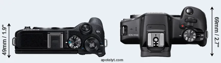 The side-by-side display below illustrates the physical size and weight of the Canon M6 Mark II and the Canon R100. The two cameras are presented according to their relative size. Three successive views from the front, the top, and the rear are shown. All width, height and depth dimensions are rounded to the nearest millimeter.